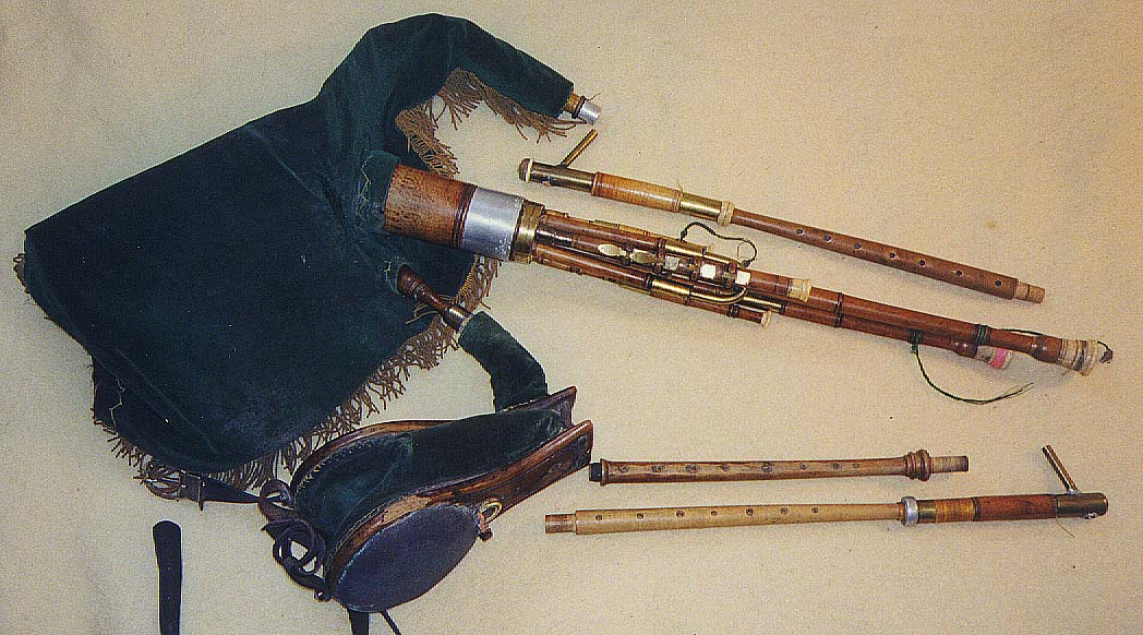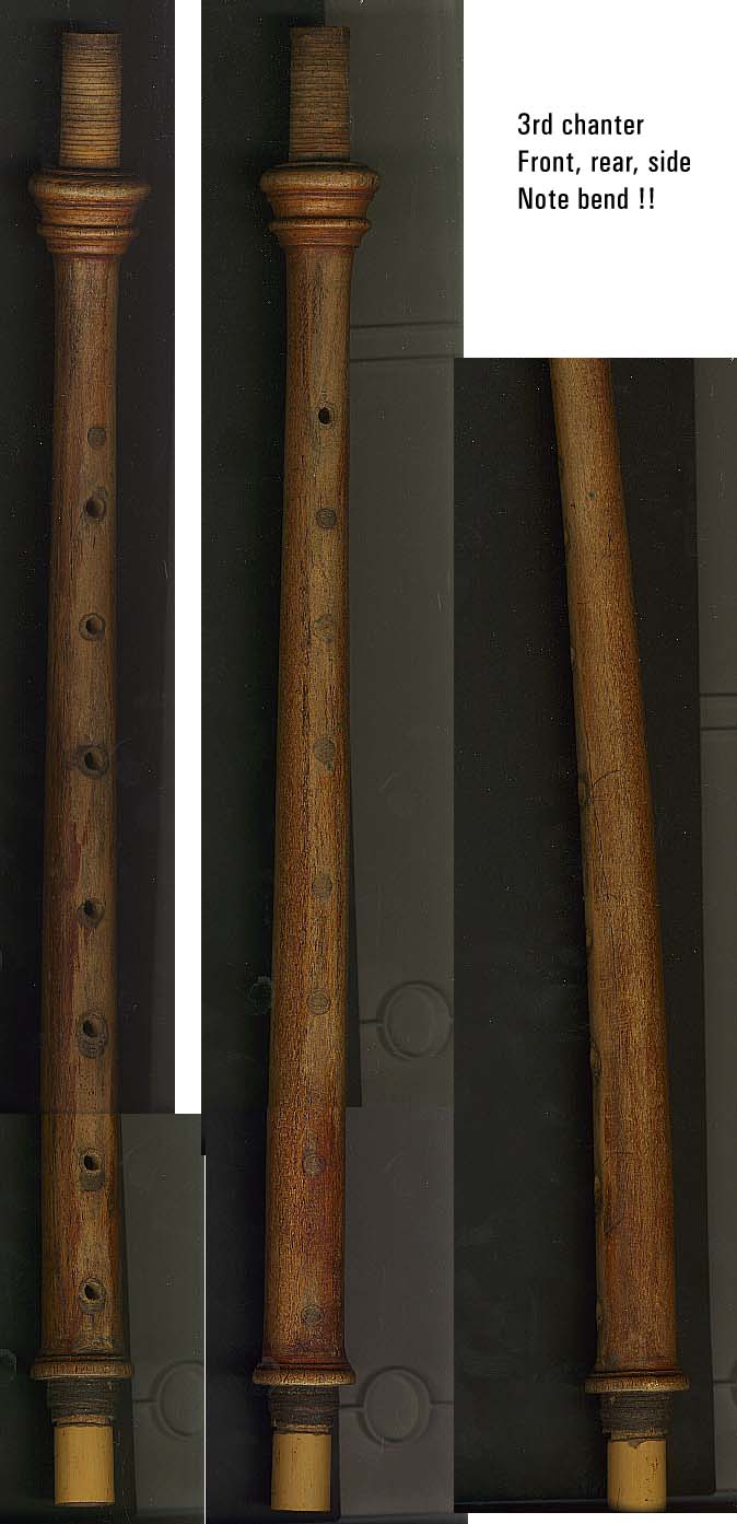 Portions of the original instrument have been crudely altered some years ago. Several alterations to the musical aspects of the chanters are evident, performed with inferior insufficiently seasoned wood or in one case, cane. Holes on one chanter were drilled out, filled with dowels and re-drilled.