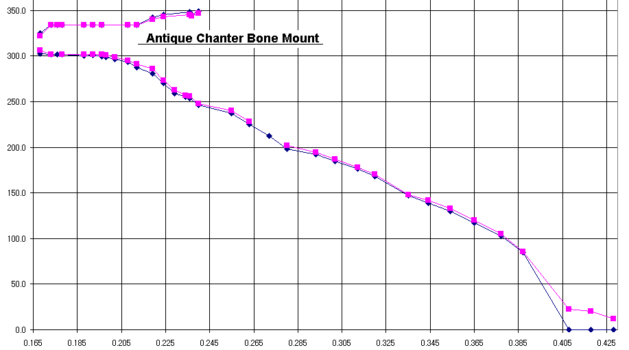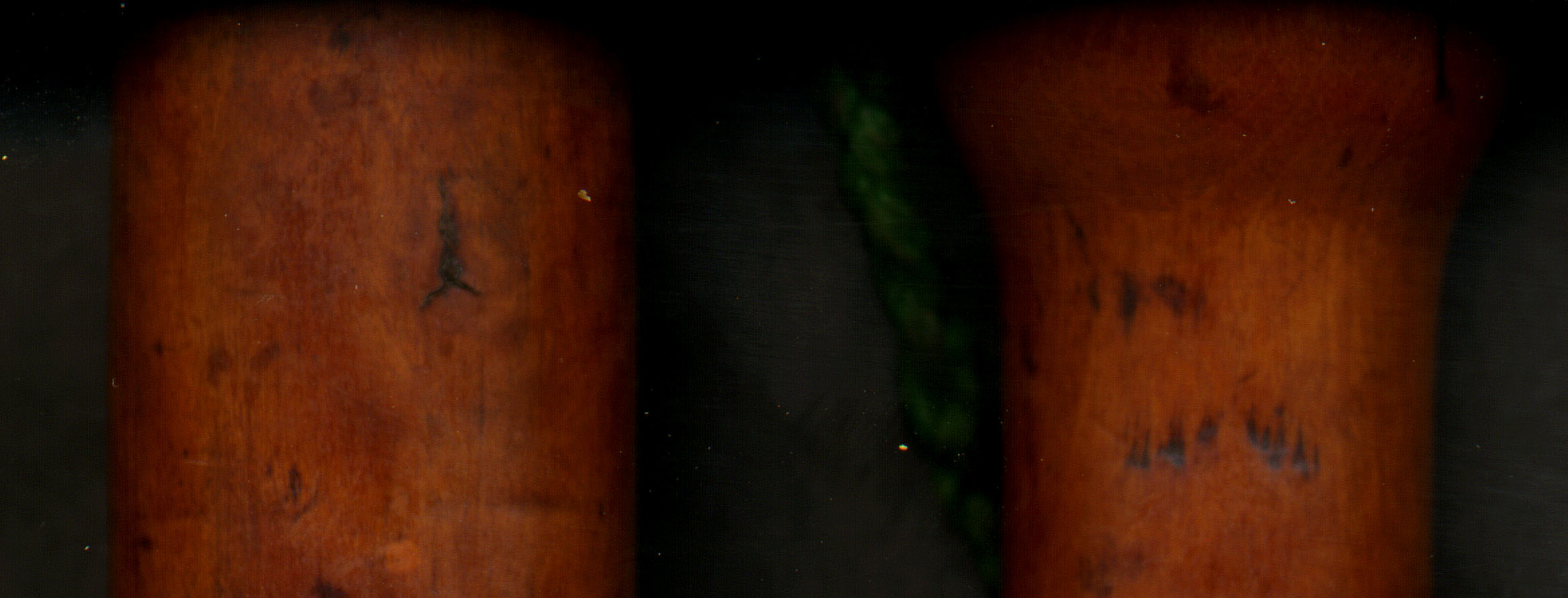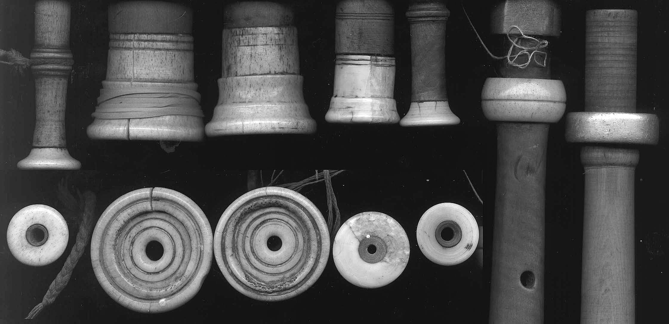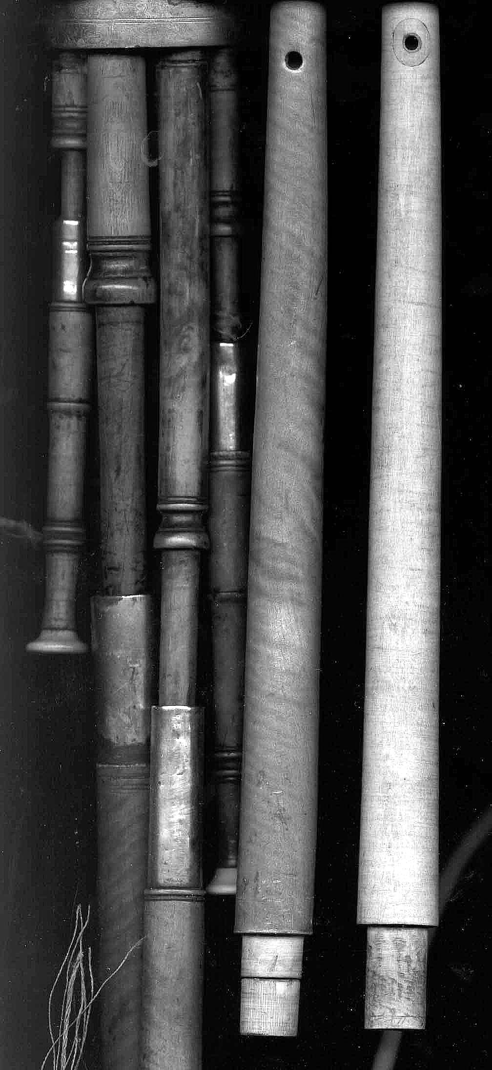 Several of the pipes have some degree of bow to them. The chanter bottoms that appear to be old are nicely round whereas the one bottom that is of newer wood has become obviously warped.