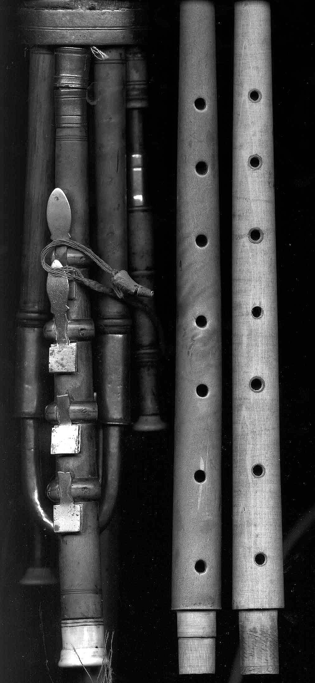 The smaller drones all appear to be in playable condition. The regulator may play once the keys are repaired or replaced. The bass drone has a complex construction and a very new-appearing crack in its top bone end, which I did not see when I first viewed the instrument at a festival last autumn.