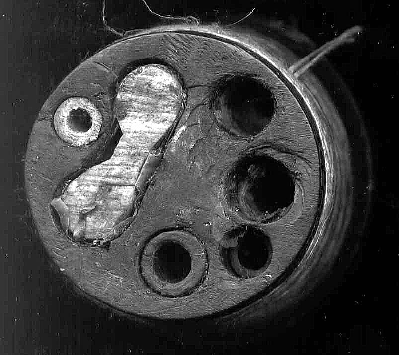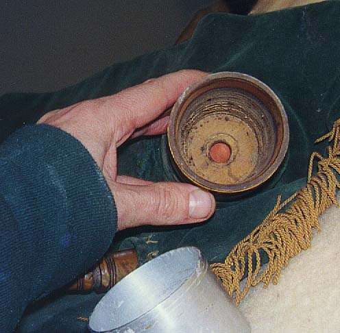 The Bass Drone is a partial "shuttle" style. There is a loop of wood and brass which does not appear to lead to any of the pipes. In fact one end is open into the mainstock to accept its reed, like the other pipes. The other end connects through a "shuttle" or air path carved through the mainstock cap, leading to the largest drone pipe sticking out of the cap. All of this together constitutes the Bass Drone.