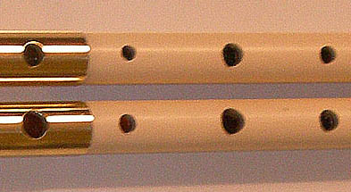 The toneholes are smaller to help reduce the sound level, but show size the variation of Concert D chanters so as to preserve the familiar Concert tonality rather than the historic narrow bore "flat" chanter sound.
